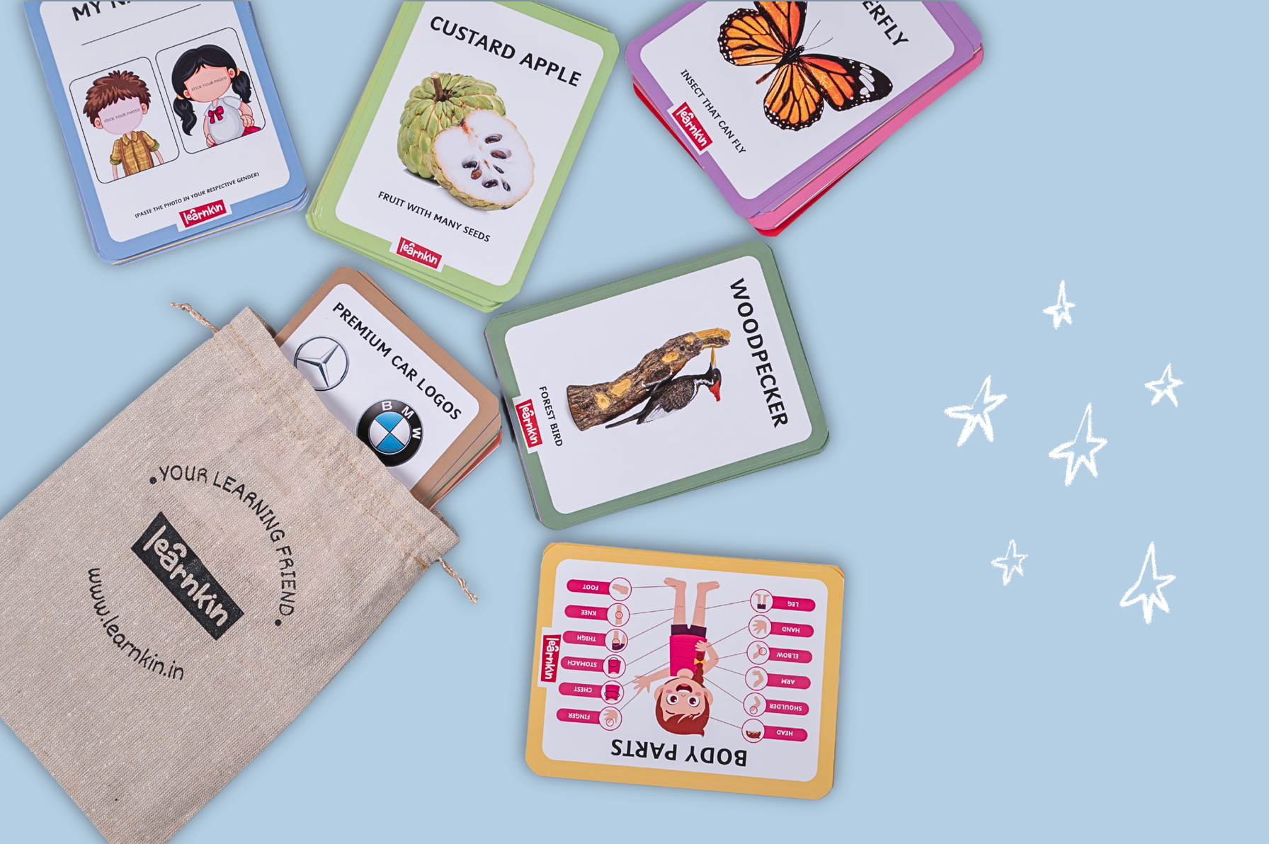 - Take flash cards of 1 level or a theme at a time and show it to your child at least 21 days, as scientifically it takes that much time for a child to remember it